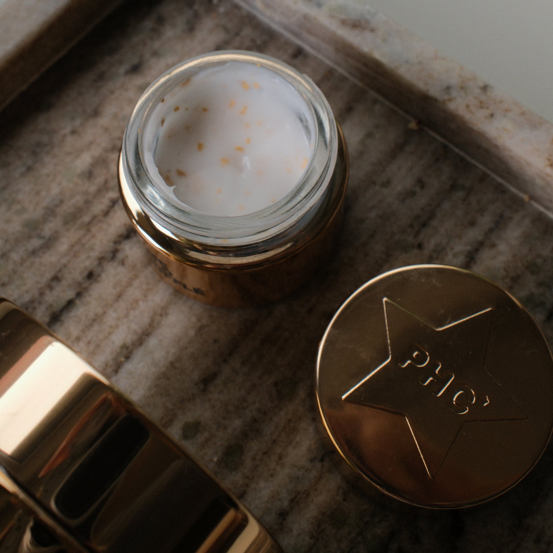 Aqua; Dicaprylyl Carbonate; Pentylene Glycol; Glyceryl Stearate SE; Hydrogenated Vegetable Glycerides; Butyrospermum Parkii (Shea) Butter; Propylheptyl Caprylate; Hexyldecanol; Hexyldecyl Laurate; Squalane; Glycerin; Cetyl Palmitate; Sodium Hyaluronate; Tetrasodium Glutamate Diacetate; Prunus Amygdalus Dulcis (Sweet Almond) Oil; Cetearyl Alcohol; Buddleja Davidii Leaf Cell Culture Extract; Sodium Stearoyl Glutamate; Xanthan Gum; Glyceryl Caprylate; Acetyl Heptapeptide-9; Panthenol; Tocopherol; Gold; Helianthus Annuus Seed Oil; Ascorbyl Palmitate; Ascorbic Acid; Caprylic/Capric Triglyceride; Colloidal Gold; Maltodextrin; Cycnoches Cooperi (Orchid) Flower/Leaf Extract; Parfum; Sodium Benzoate; Potassium Sorbate; Citric Acid; Geraniol; Linalool; Cinnamyl Cinnamal; Benzyl Salicylate